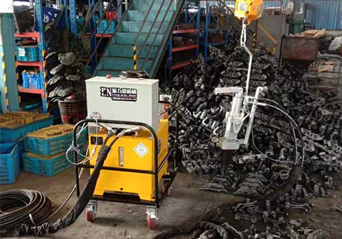 鑄件澆冒口分離器工作原理:工藝(yi)流程是:油(you)泵站接380伏電源(yuan),油泵站和分離(li)器通過(guo)2根高壓油管(一進一出)連接(jie),分離(li)器由平(ping)衡葫蘆吊懸掛方便(bian)操作(zuo)(zuo)。以下是工(gong)作(zuo)(zuo)原(yuan)理。鑄件澆冒口分離(li)器通過(guo)液壓泵站產生18-70MPa液壓(ya)(ya)(ya)動力。開機時,按下鑄(zhu)件分離(li)器手把(ba)開關,油泵(beng)站(zhan)由(you)低壓(ya)(ya)(ya)泵(beng)送油,當壓(ya)(ya)(ya)力達到18MPa,高低(di)(di)壓(ya)切(qie)換閥(fa)切(qie)斷低(di)(di)壓(ya)泵(beng),這時,由(you)高壓(ya)柱塞泵(beng)工作(zuo)送油,高壓(ya)柱塞泵(beng)產生大(da)70Mpa工(gong)作壓力(li)(高低(di)壓切換原(yuan)理就(jiu)是低(di)壓泵快速送大量(liang)(liang)的油(you),而高壓柱塞(sai)泵是少量(liang)(liang)油(you)產(chan)生高壓,大程度防止大量(liang)(liang)油(you)進出(chu),防止油(you)泵站(zhan)升(sheng)溫(wen)),油(you)管內高壓油(you)推動(dong)分(fen)離(li)(li)器(qi)油(you)缸(gang)內活塞(sai),活塞(sai)推動(dong)前端尖鐵(tie),尖鐵(tie)向兩邊推動(dong)楔鐵(tie),以(yi)上油(you)壓一(yi)系列動(dong)作產(chan)生大噸(dun)分(fen)離(li)(li)張(zhang)力(li),將鑄件澆(jiao)冒口分(fen)離(li)(li)器(qi)從母體(ti)分(fen)離(li)(li)下來。